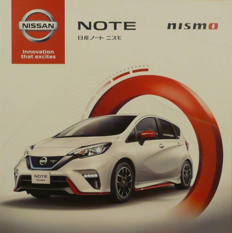 Een Japanse brochure met 16 pagina's. Uitgifte datum 05-2019. Beschrijft de Note Nismo.
