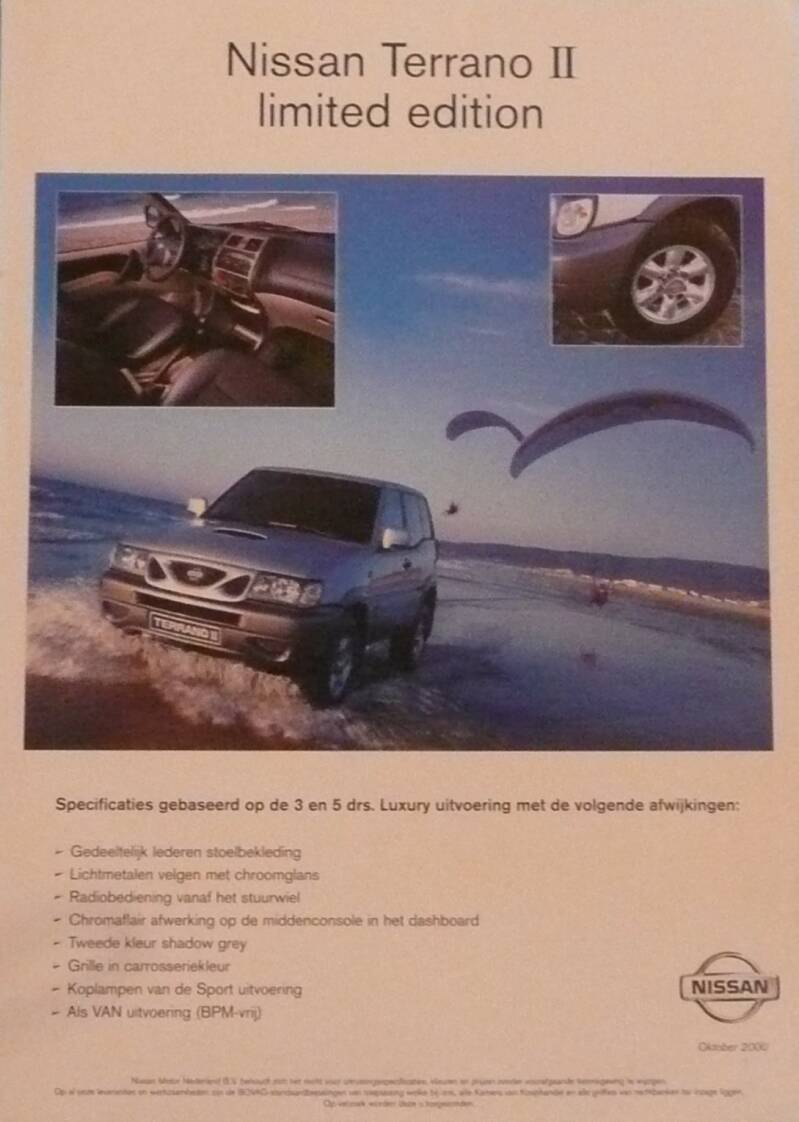 Een Nederlandstalige enkelzijdige leaflet van de Terrano II Limited edition. Uitgifte datum 10-2000.