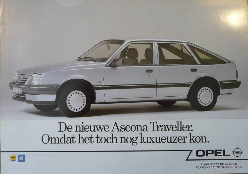 Een Nederlandstalige leaflet. Uitgifte datum niet bekent, zo rond 1985. Beschrijft de Ascona Traveller.