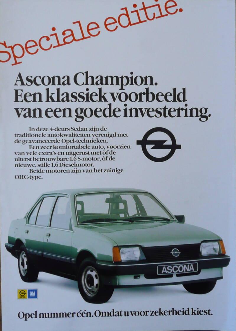 Een Nederlandstalige leaflet. Uitgifte datum niet bekent, zo rond 1983. Beschrijft de Ascona Champion.