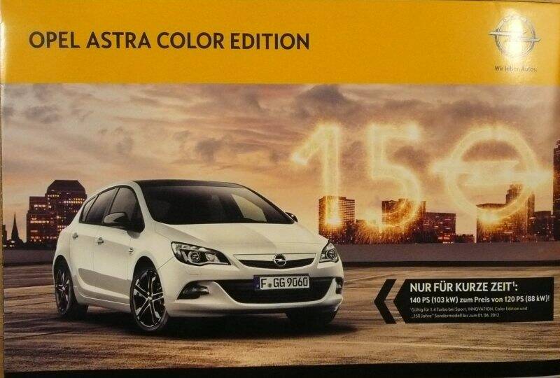 Een Duitstalige brochure met 8 pagina's. Uitgifte datum 02-2012. Beschrijft de Astra Color Edition.