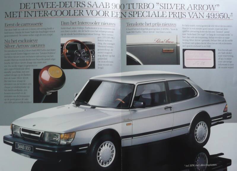 Een Nederlandstalige brochure met 4 pagina's. Uitgifte datum niet bekent. Beschrijft de Saab 900 Silver Arrow model 1986.