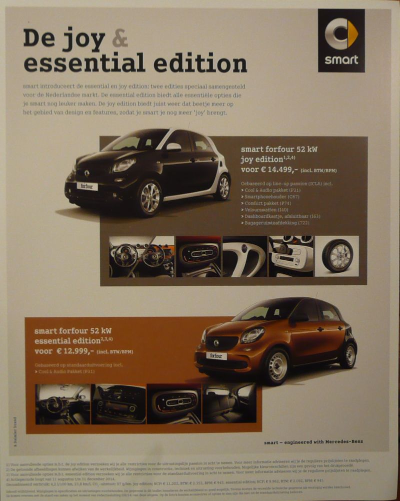 Een Nederlandstalige leaflet. Uitgifte datum 08-2014. Beschrijft de Forfour Joy en Essential sdition.
