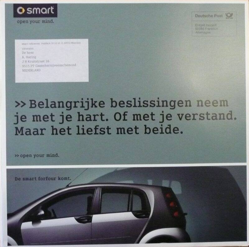 Diverse Nederlandstalige brochures die zijn uitgeven tijdens de introductie van de ForFour. Alle zijn uitgegeven in 2003. In het rode exemplaar zit zelfs een stuk chocolade. Zijn alle via de post verstuurd.