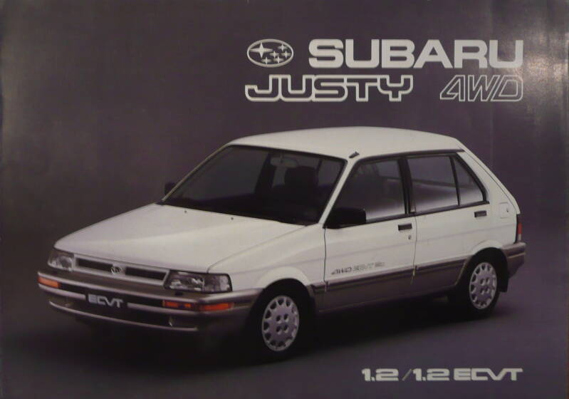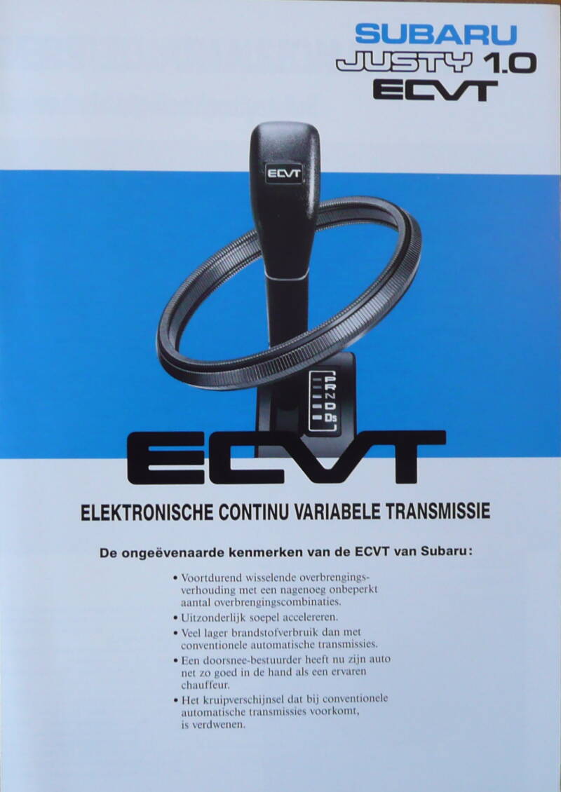 Een Nederlandstalige brochure met 4 pagina's. Uitgifte datum niet bekent, zo rond 1988. Beschrijft de Justy 1.0 ECVT.