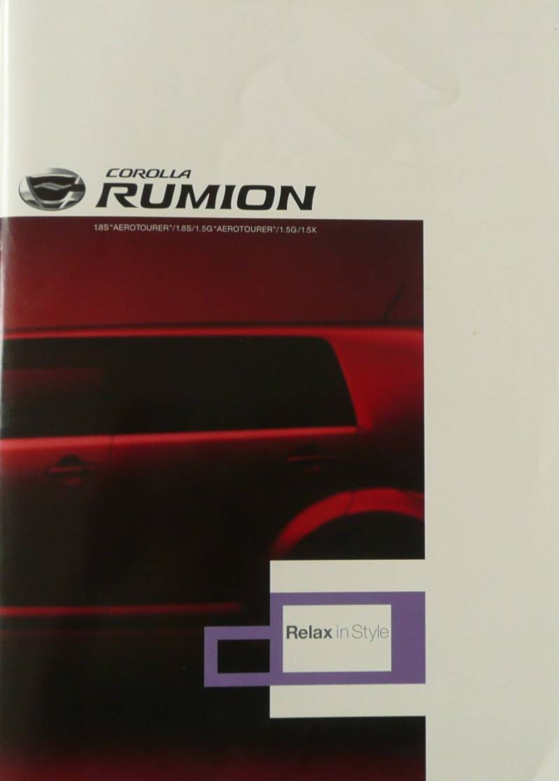 Een Japanse brochure met 4 pagina's. Uitgifte datum 07-2012. Beschrijft de Corolla Rumion Chocolade.