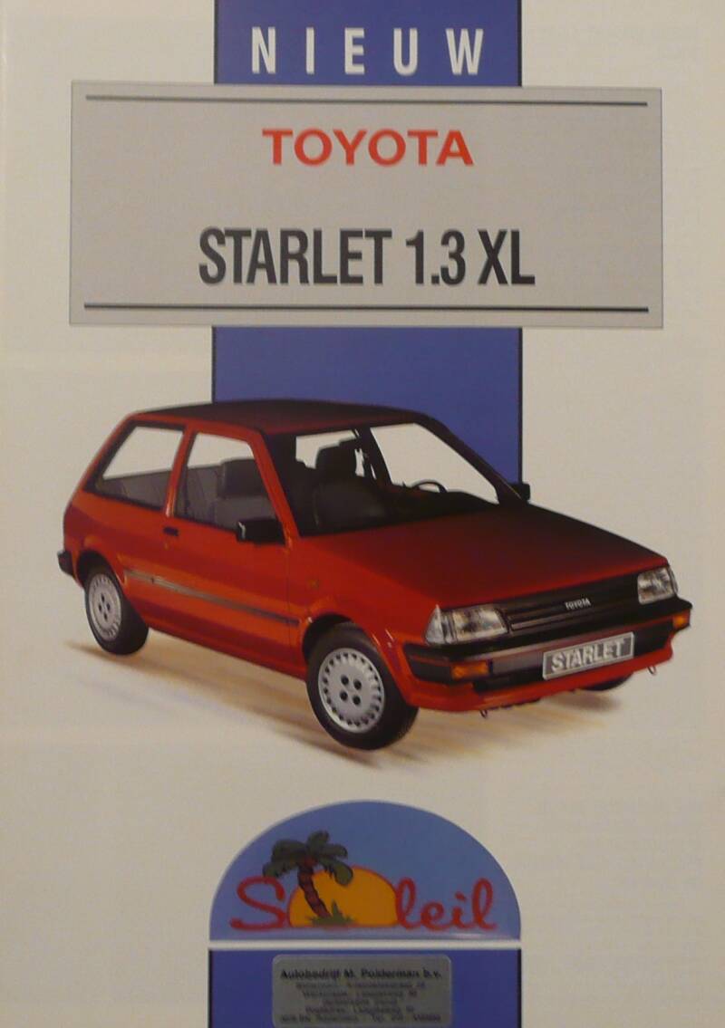 Een Nederlandstalige brochure met 4 pagina's. Uitgifte datum niet bekent. Beschrijft de Starlet 1.3 XL Soleil.