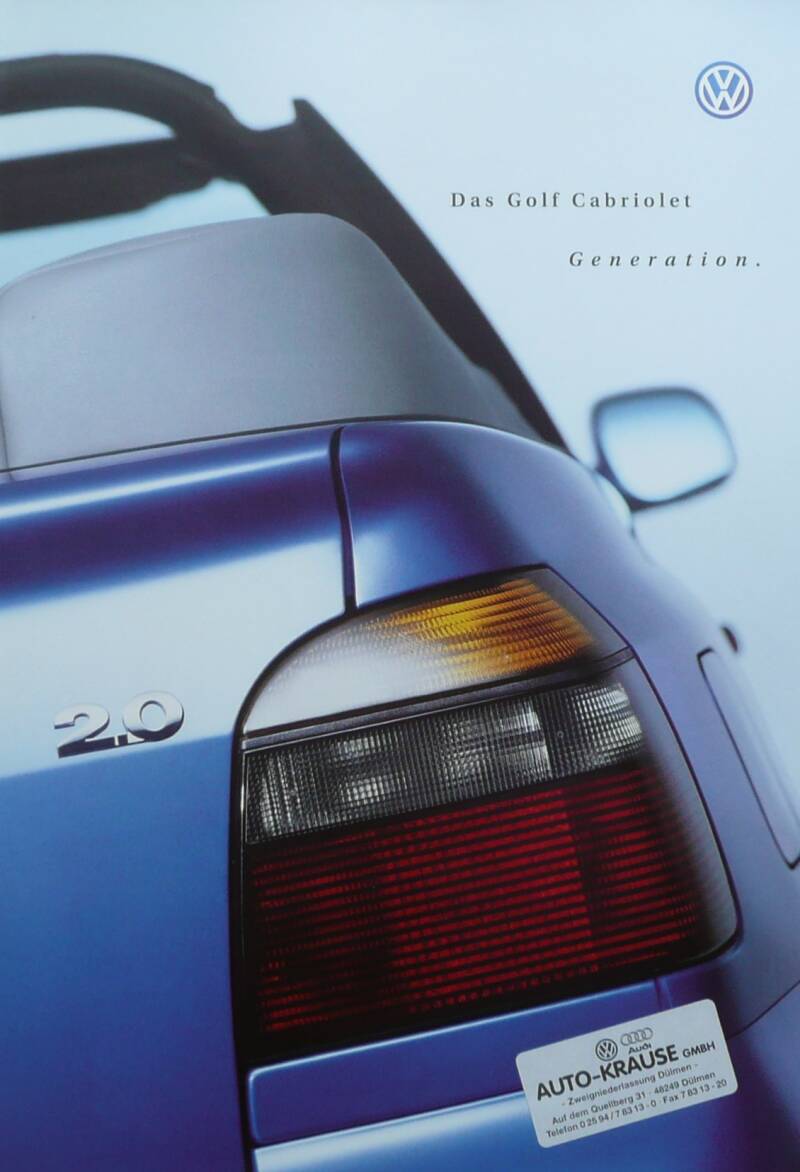 Een Duitstalige brochure met 16 pagina's. Uitgifte datum 09-1999. Beschrijft de Golf Cabrio Generation.